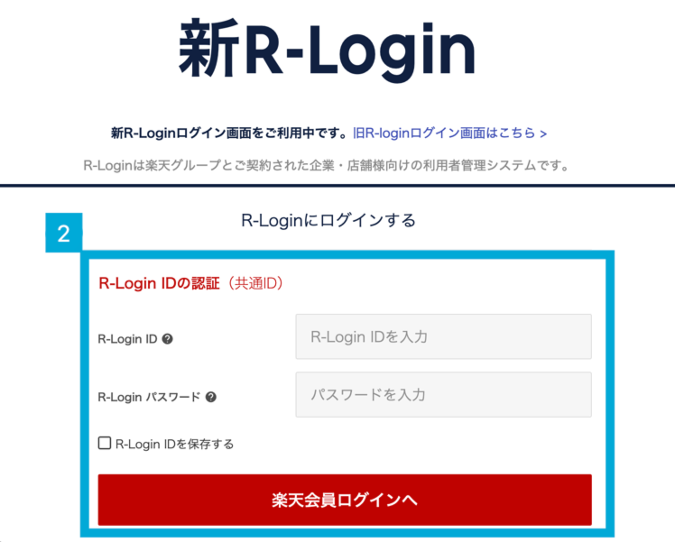 - R-Login IDとパスワードを入力し、楽天会員ログインへボタンを押します。