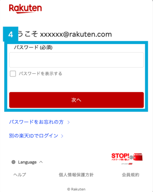 - 管理者のご自身の楽天会員パスワードを入力し、[次へ]ボタンを押します。